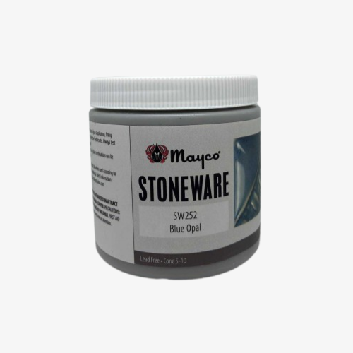 Cone 6: Blue Opal is a medium blue semi-transparent to fully opaque gloss glaze. Thinner applications create a transparent blue haze; thicker coatings produce an